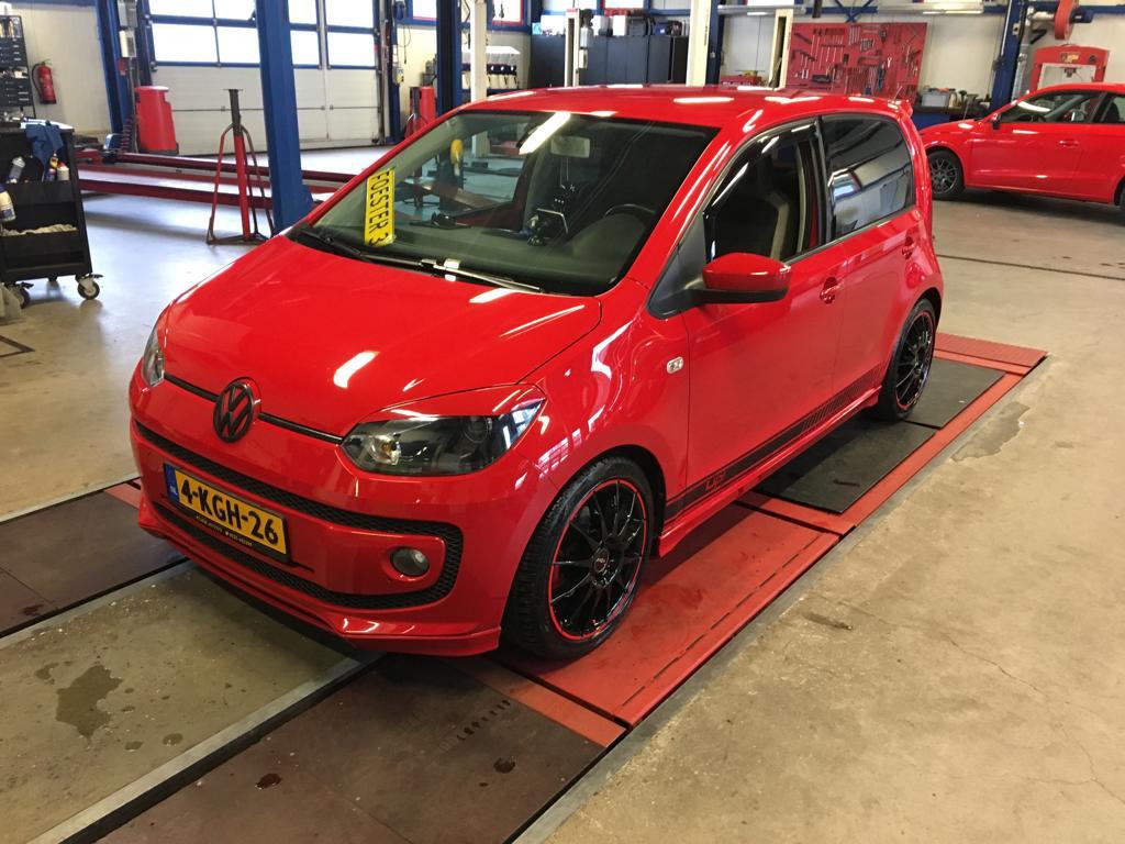 VW HIGH UP! 44KW/60PK rouge: geblindeerde ramen, Xenon projector verlichting, LED achterlichten, achterspoiler, diffusor, uitlaatsierstuk, instaplijsten, zijwindschermen, blacked out front en back, 17'' OZ Superturismo GT matt black.