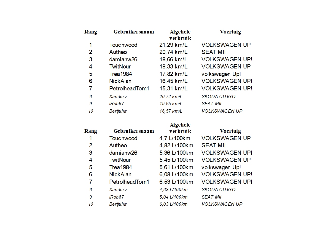 Door de binnenkomst van drie nieuwe deelnemers, zien we direct wat leuke verschuivingen. Twee van de drie laten direct zien, dat ze van zuinig rijden houden! Eén daarvan is zelfs een LPG rijder. Ik ga er vanuit, dat de literopgave dan ook voor hem LPG betreft. En voor zover ik weet, is LPG iets minder krachtig dan benzine, waardoor je er iets meer van verbruikt. Een binnenkomer op plek 4 lijkt me daarmee een hele mooie prestatie!